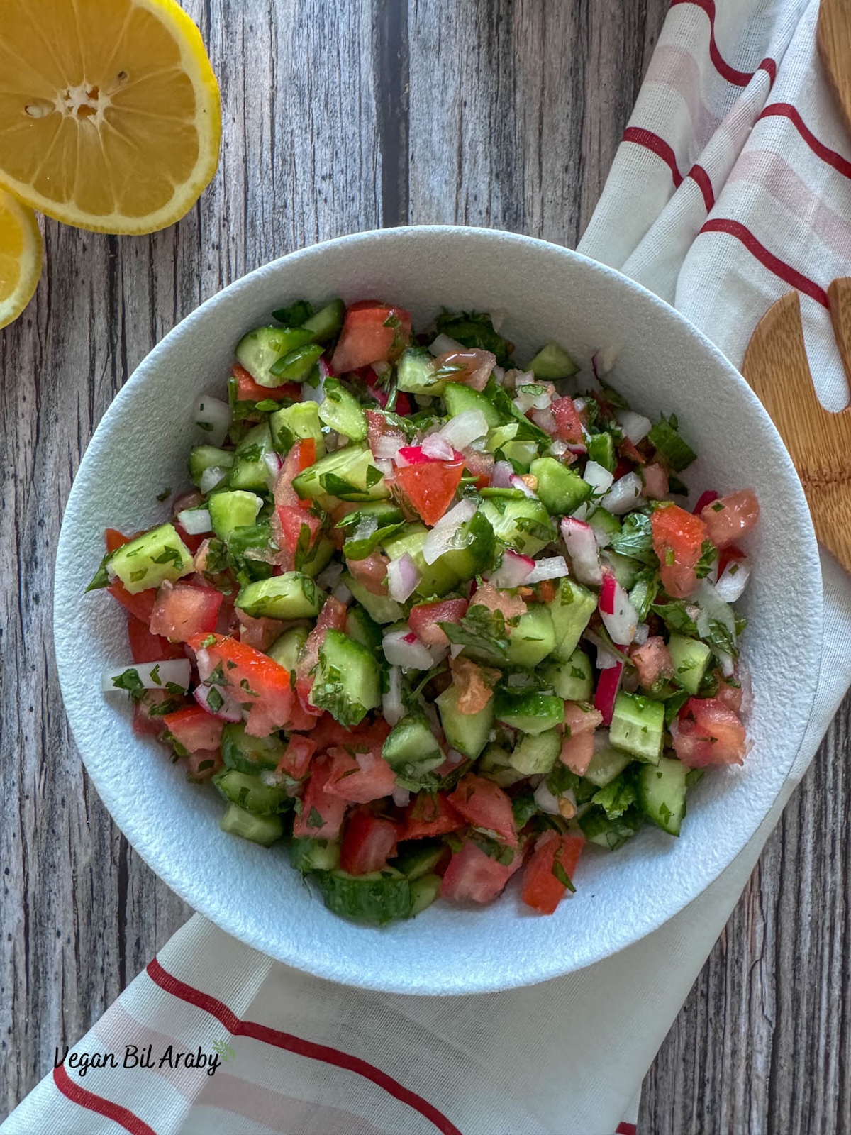 Diced tomatoes, mint, cucumber, parsley, olive oil, lemon, onions.