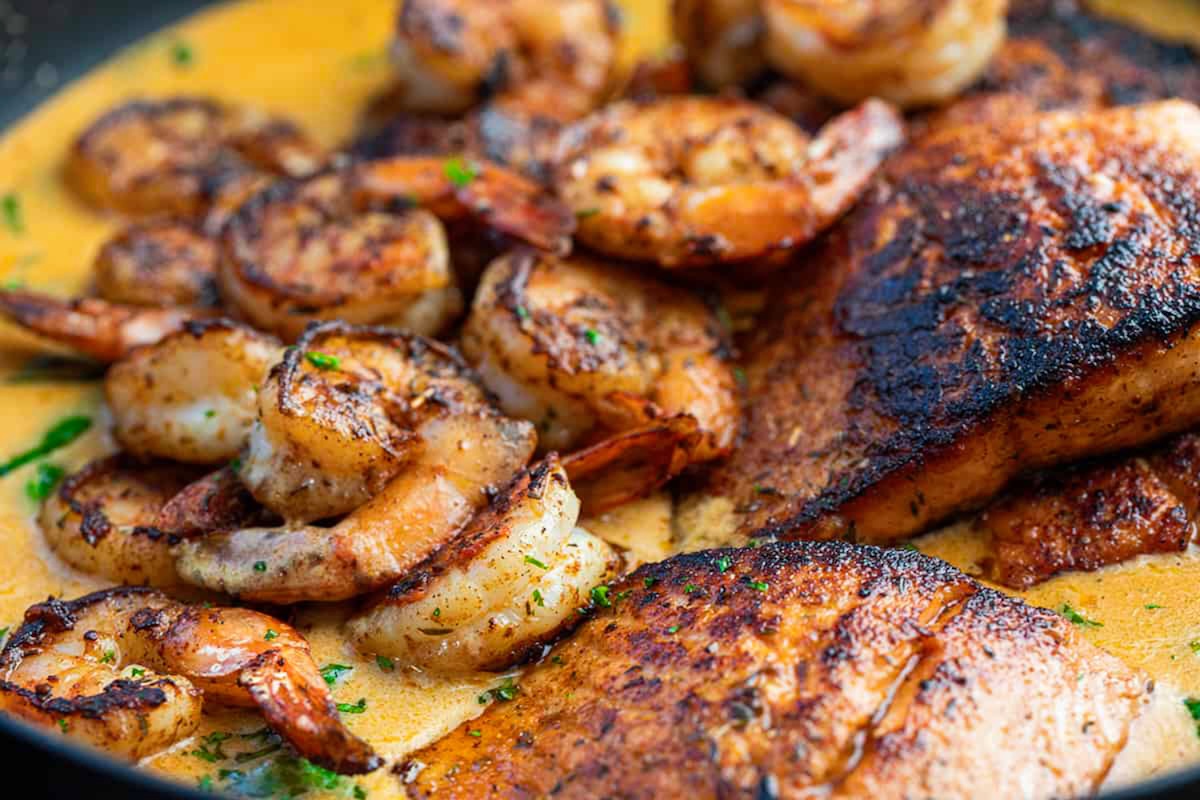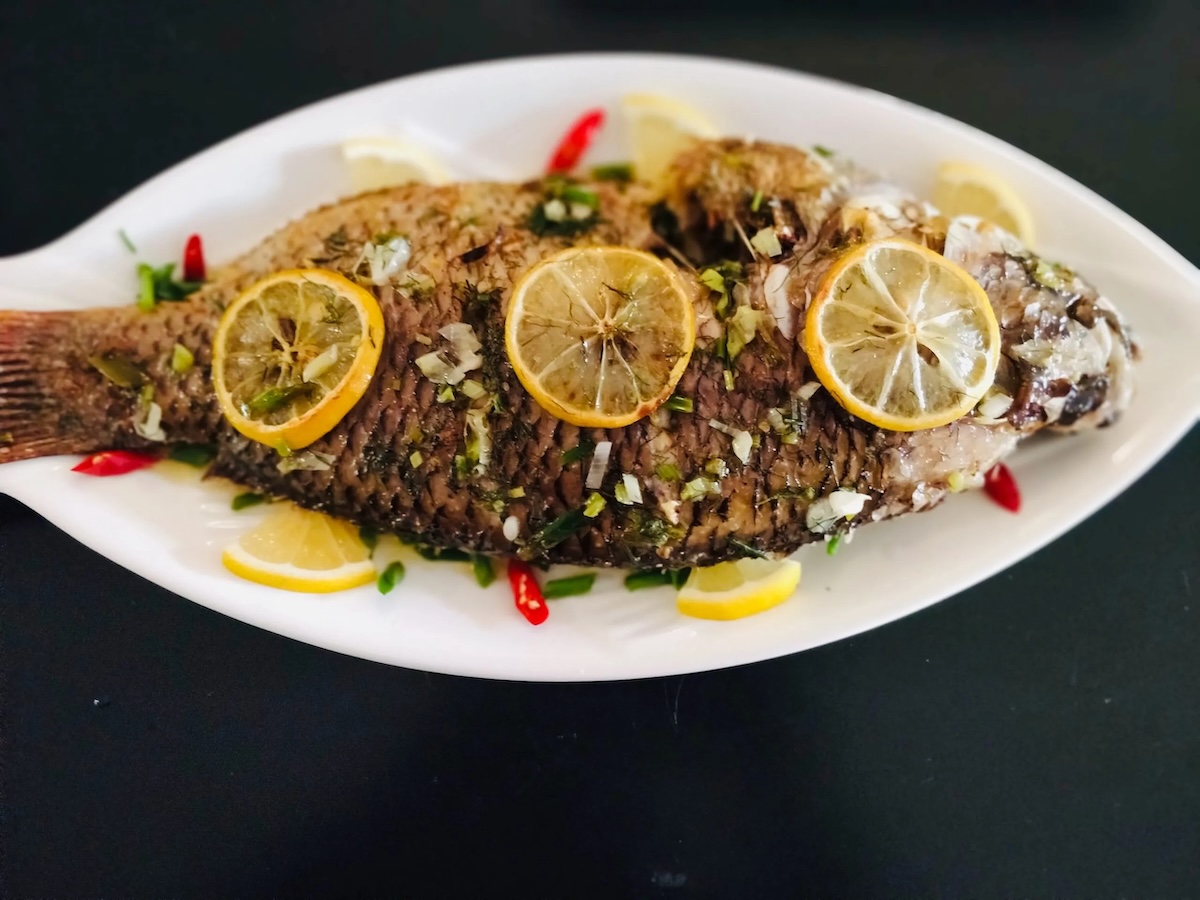 Shrimp, salmon, garlic, onions, cilantro, served w rice, vegetables